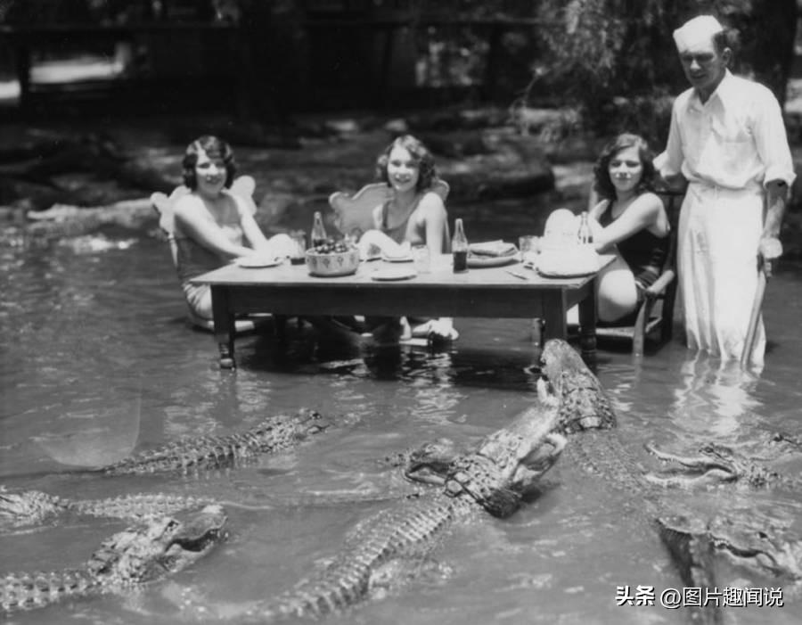 15:1907年到1953年间,在洛杉矶的加州鳄鱼农场野餐,顾客可以和受过训练的鳄鱼一起游戏。